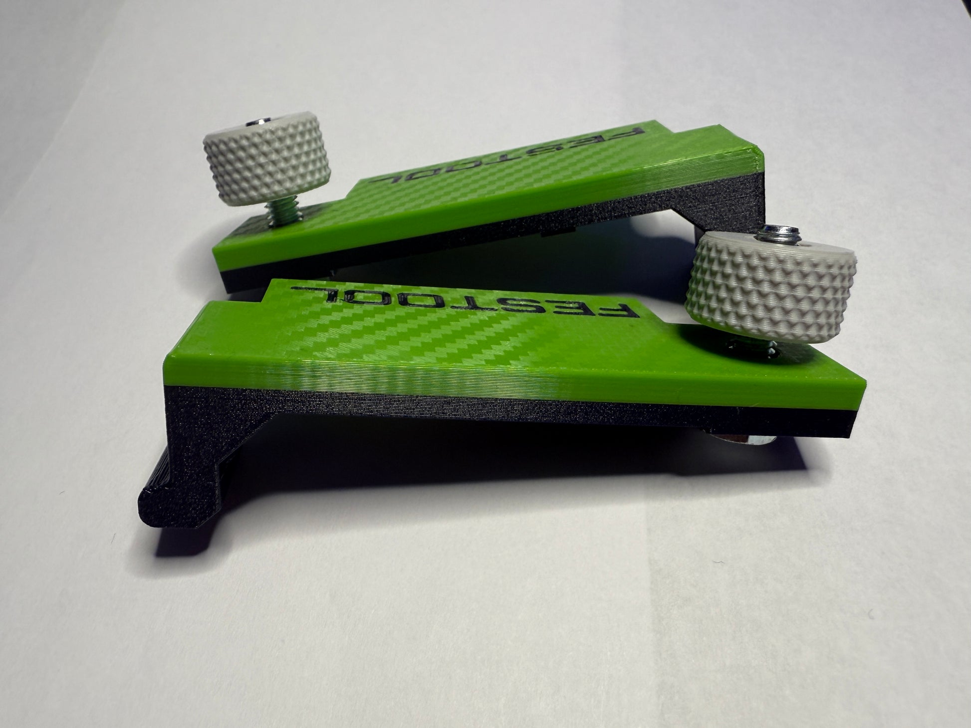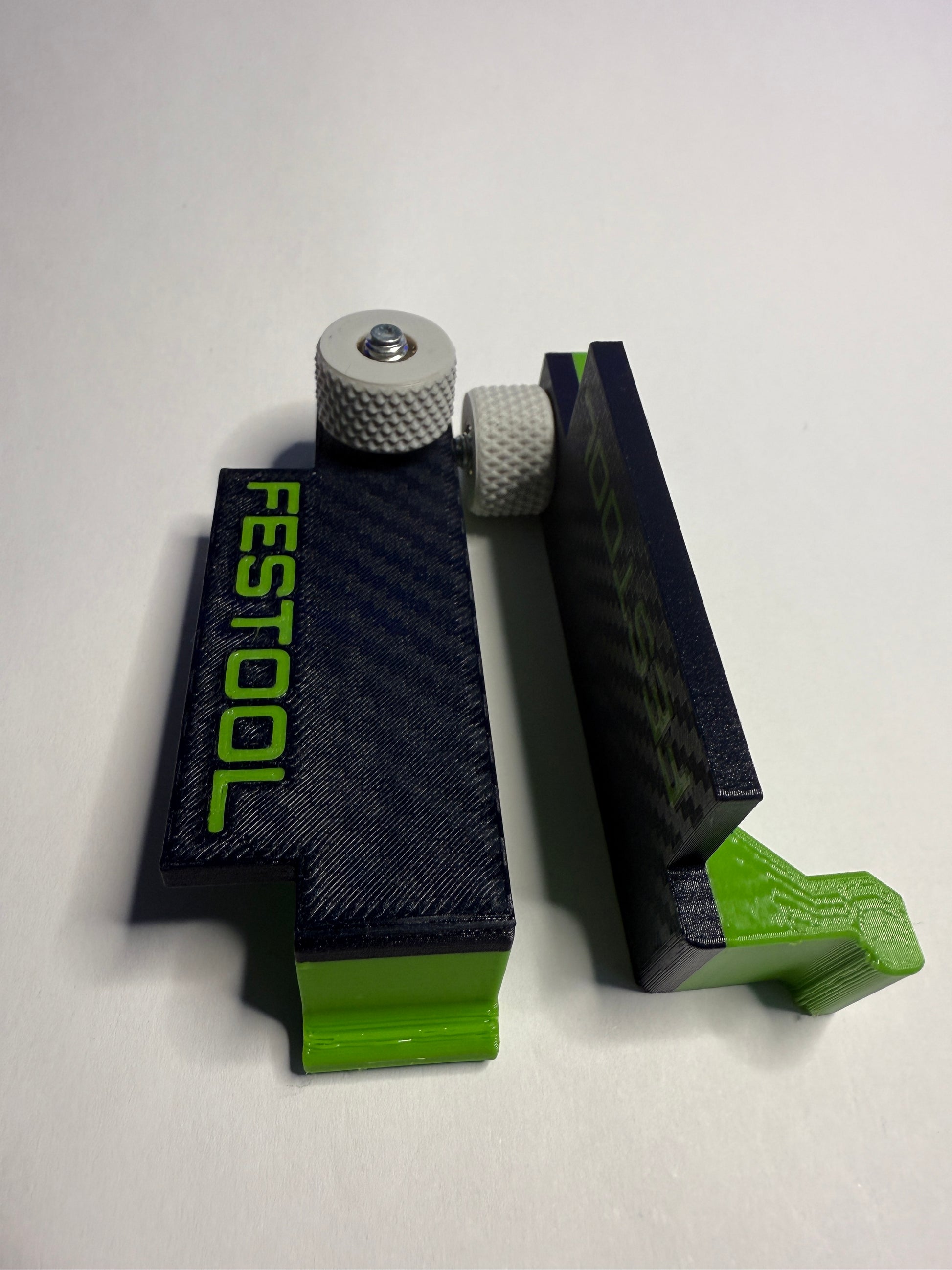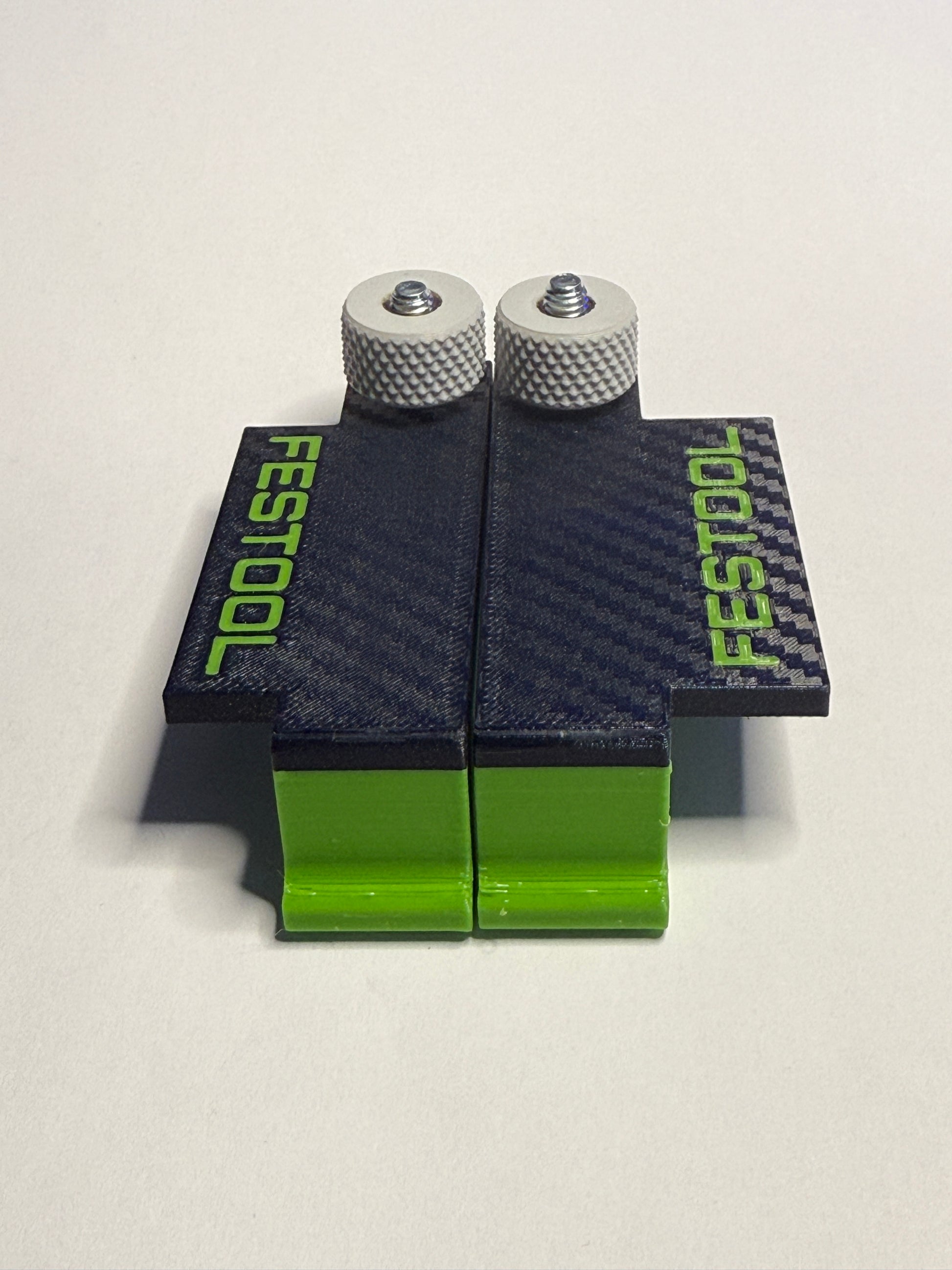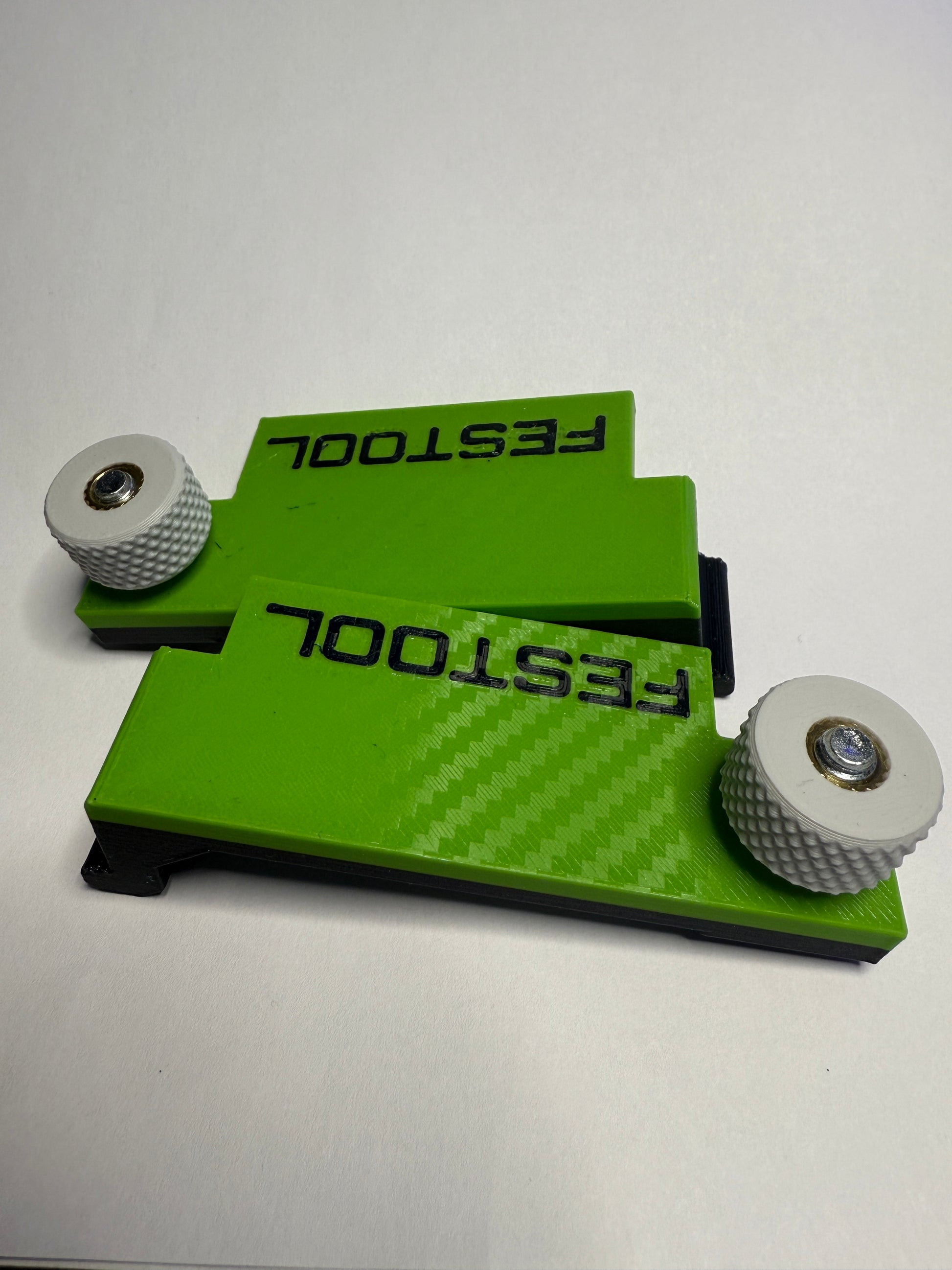 This Is a TWO TONE Blue/ Green, limited edition 3D printed anti tip assist with my new colour scheme. The set includes the new V2.0 improved front and rear anti tip assist correctly colour coded with festool blue and green with a carbon fibre finish to the top and festool logo which is filled in contrasting colour, updated grey thumb turn knobs with M6 solid brass heat set inserts and a redesigned track slide making removal from the guide rail a breeze! and it’s 100% infill (solid). These are the more robust version of others being sold with a 25% infill which means they are harder wearing being made from PETG-CF(carbon Fibre) and will last a lot longer. Guaranteed strength! The fixing is central to the tip assist with a wider, more robust base. The kit comes complete with both front and rear anti tip bases x 2, M6 thumb turn knobs x 2 and M6 bolts x 2 so nothing to add, simply affix to your TS55/ TSC55 and off you go.