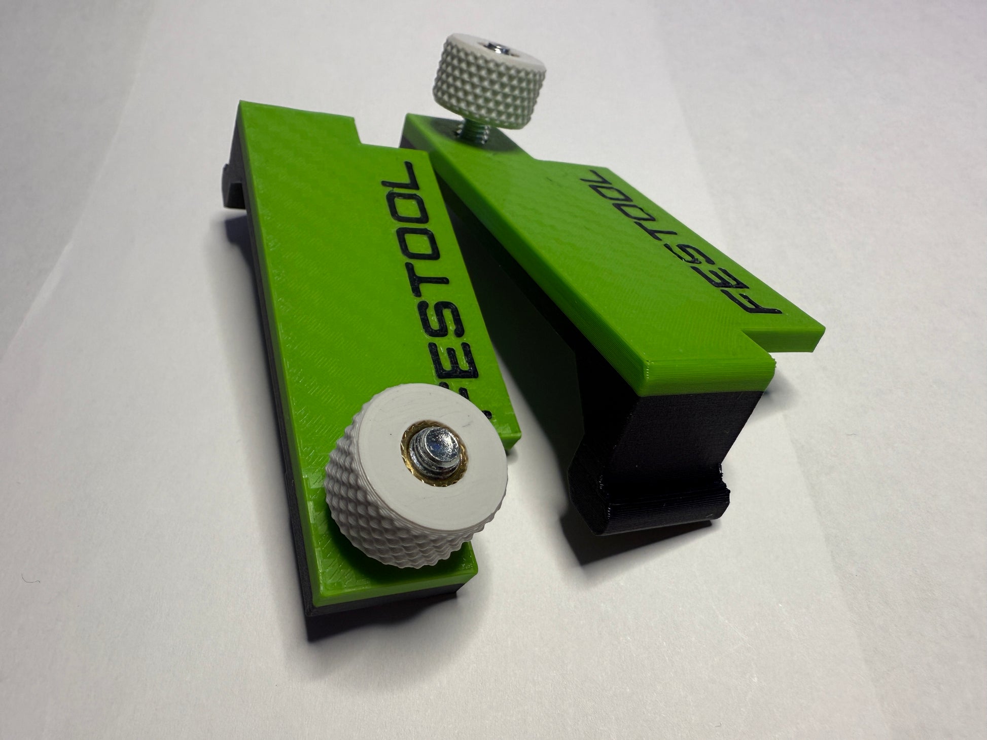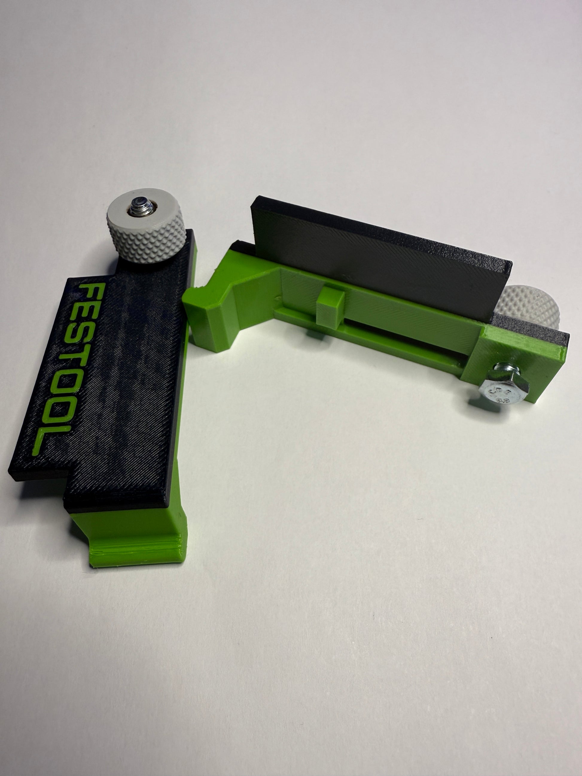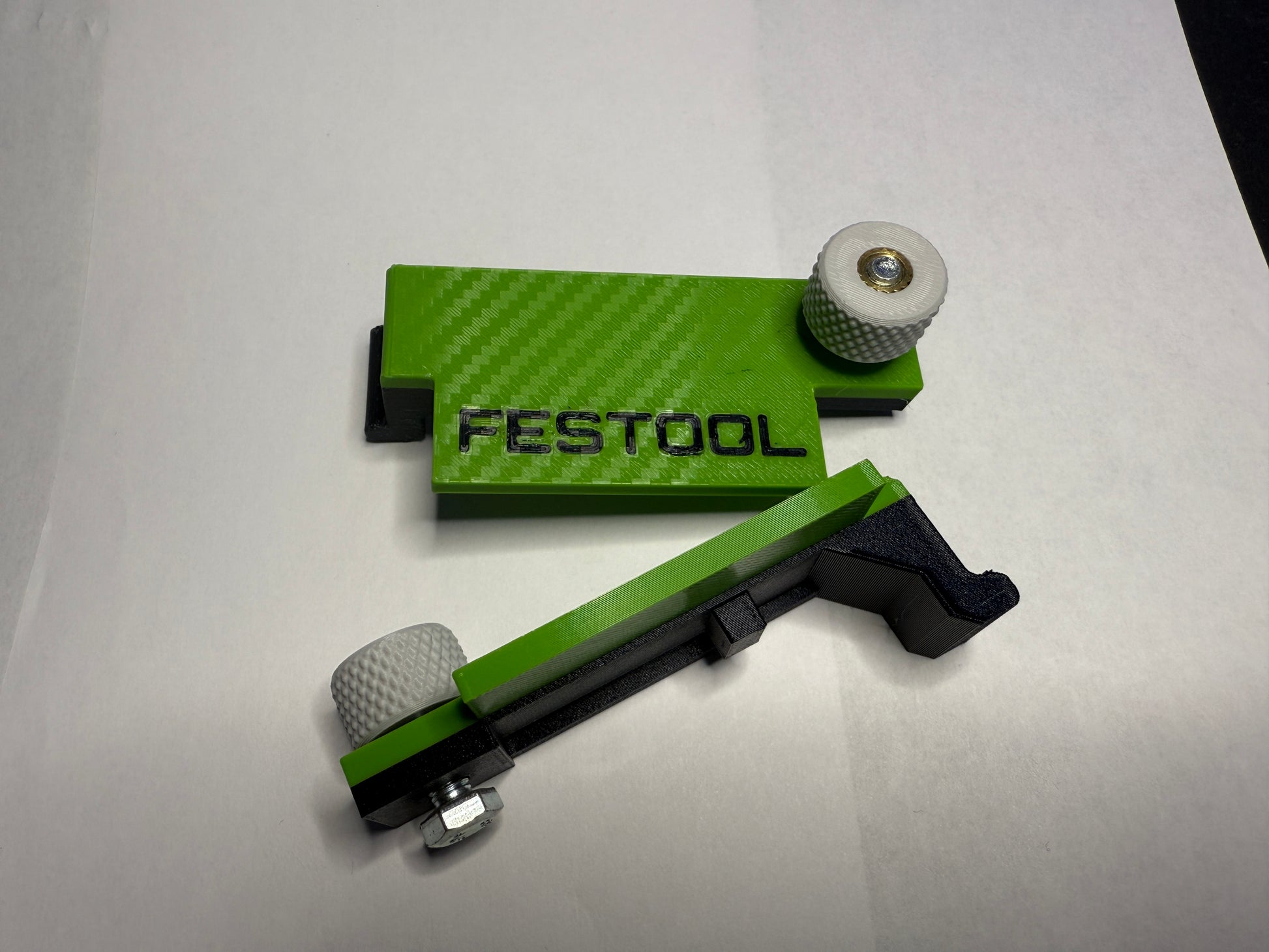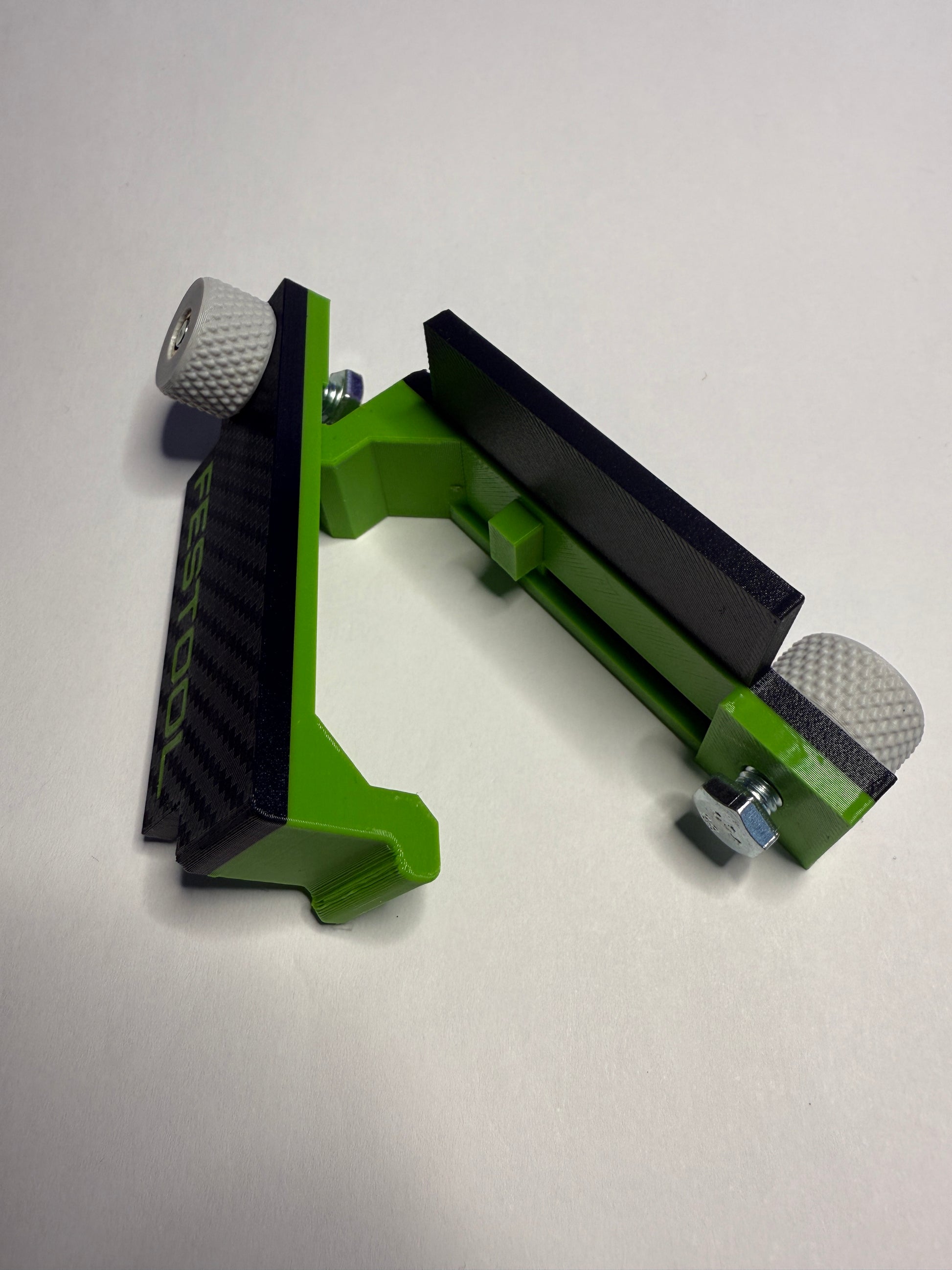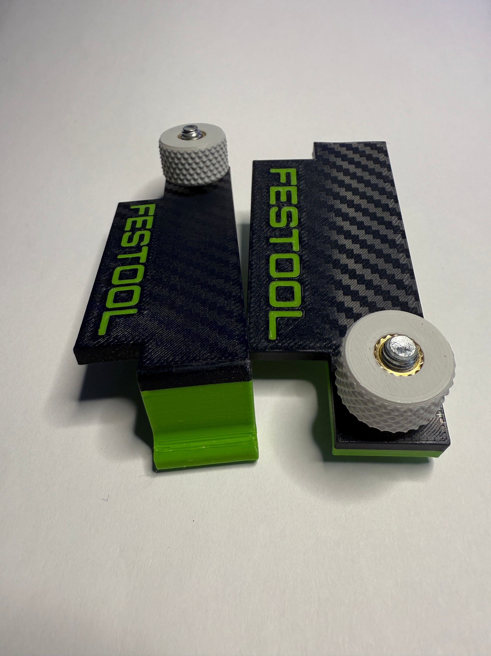 This Is a TWO TONE Blue/ Green, limited edition 3D printed anti tip assist with my new colour scheme. The set includes the new V2.0 improved front and rear anti tip assist correctly colour coded with festool blue and green with a carbon fibre finish to the top and festool logo which is filled in contrasting colour, updated grey thumb turn knobs with M6 solid brass heat set inserts and a redesigned track slide making removal from the guide rail a breeze! and it’s 100% infill (solid). These are the more robust version of others being sold with a 25% infill which means they are harder wearing being made from PETG-CF(carbon Fibre) and will last a lot longer. Guaranteed strength! The fixing is central to the tip assist with a wider, more robust base. The kit comes complete with both front and rear anti tip bases x 2, M6 thumb turn knobs x 2 and M6 bolts x 2 so nothing to add, simply affix to your TS55/ TSC55 and off you go.