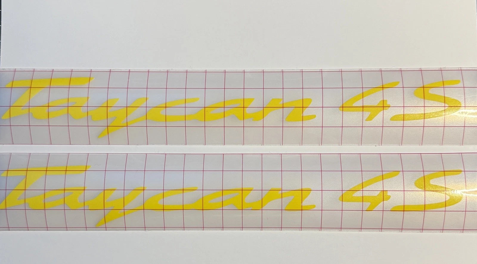 One set of left & right door decals for the German car manufacturers Taycan model, exact replacement for the original decals in a colour of your choice. 28cm x 3.91cm. Choose your colour from the drop down box and add to basket, you will receive a pair of vinyl decals and an easy application squeegy as per the photos and the decals/ stickers will arrive on a transfer sheet with FREE felt faced squeegy for easy diy installation. High quality vehicle vinyl guaranteed for 5 years in direct sunlight. Please watch the video linked at the bottom of the listing if you have never fitted decals before.